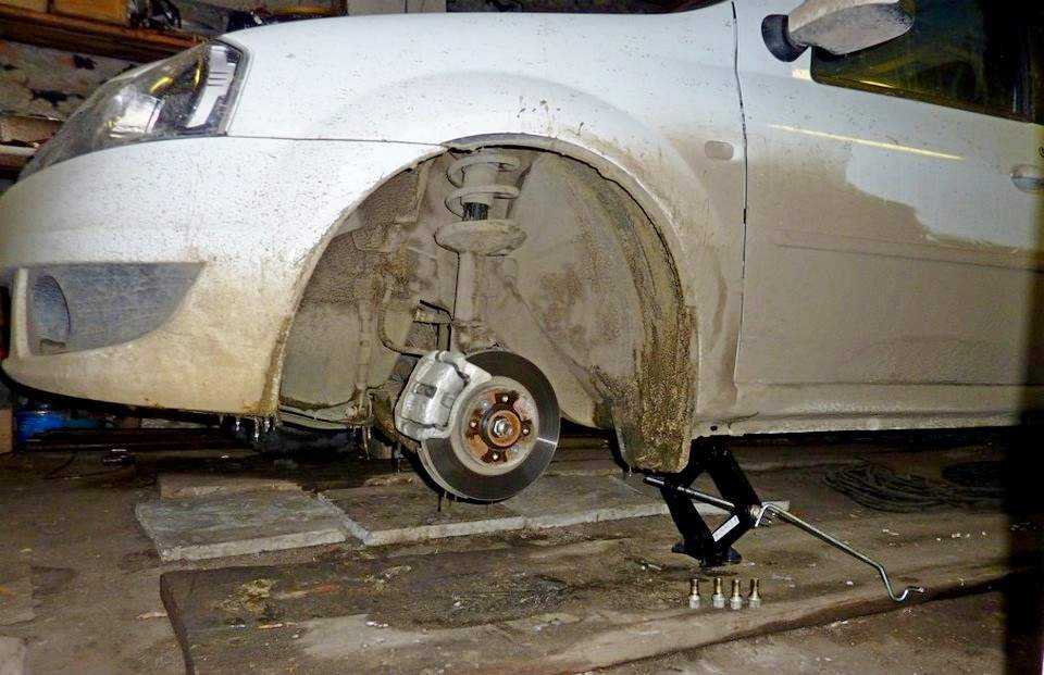Подготовительный этап работ начинается с фиксации автомобиля ручным тормозом и колесными башмаками, продолжается поддомкрачиванием одной стороны авто и завершается снятием переднего колеса.