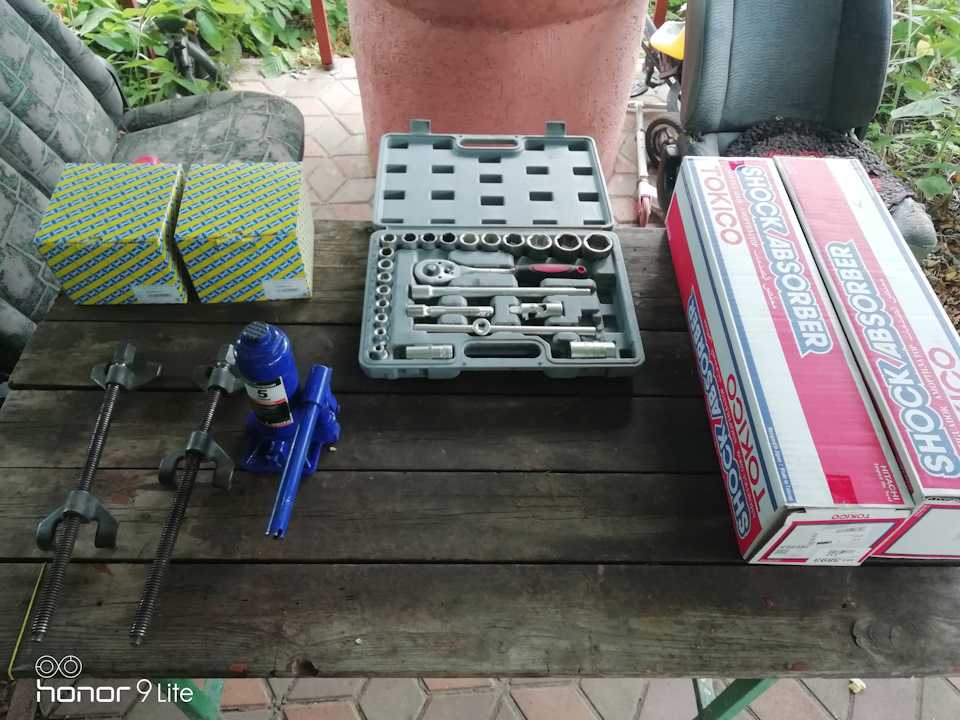 Менять на сервисе не хотел, т.к. для данной процедуры руки на месте ))Прикупил инструмент в виде:1. Набор инструментов.2. Стяжки для пружин.3. Новый домкрат, т.к. старый спёрли.