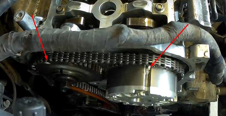 - метки на звёздочках и шестернях надо точно совмещать с метками на корпусе двигателя, поворачивая коленчатый вал по ходу вращения. За два оборота коленвала распредвал совершает один оборот.