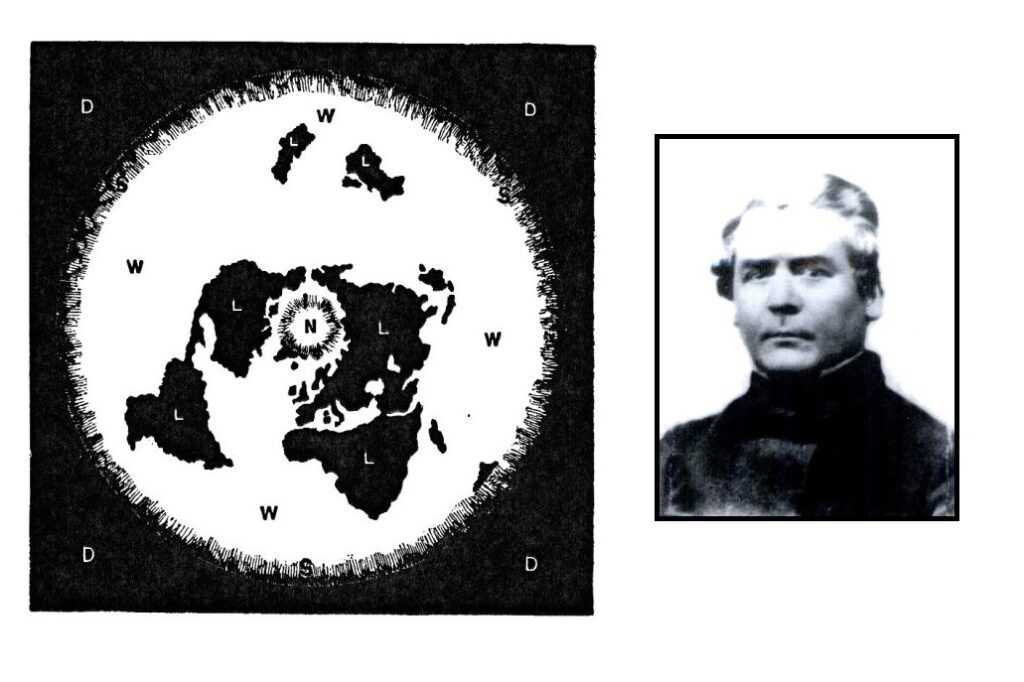 Он придумал свою схему устройства Земли. Горе-исследователь представил планету как диск с центром на Северном полюсе, окруженный со всех сторон высокой ледяной стеной — Антарктидой. Над всем этим, на высоте в 4800 км вращаются Солнце и Луна, а космос начинается на расстоянии в 5 тысяч км.
